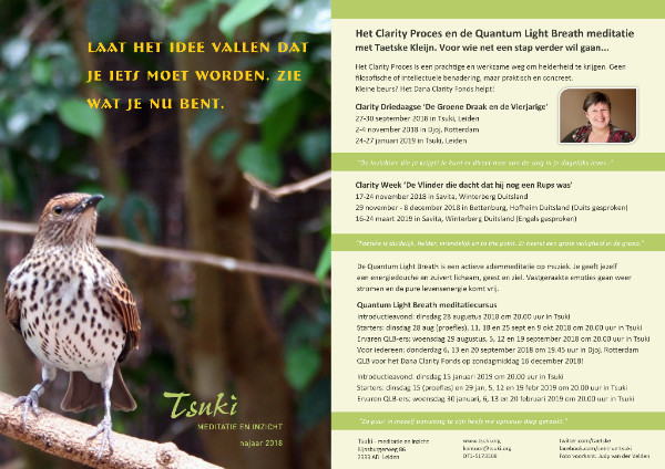 Quantum Light Breath voor ervaren QLB-ersEen cursus van 4 avonden op 29 augustus, 5, 12 en 19 september om 20.00 uur in Tsuki. Met Clarity oefeningen en een inhaalmogelijkheid voor een gemiste keer op dinsdag 24 oktober. Deelname per losse avond is ook mogelijk.