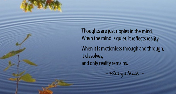 Een van mijn favoriete citaten van Nisargadatta is: Thoughts are just ripples in the mind. When the mind is quiet, it reflects reality. When it is motionless through and through, it dissolves, and only reality remains.