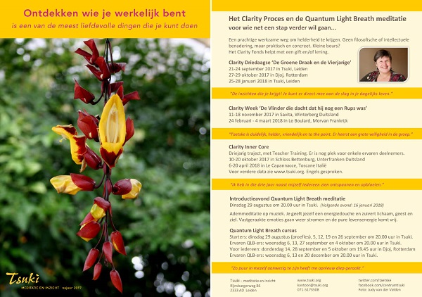 De Driedaagse kan je in september in Leiden in Tsuki doen, en in oktober in Oldenzaal en in Rotterdam. Voor de Clarity Week kan je in november naar Savita. Dat ligt in de uitgestrekte bossen in het Sauerland. Bijzonder van deze plek is dat er voor iedereen een eenpersoonskamer is, met eigen douche/wc.